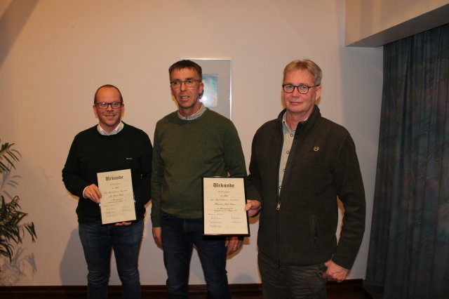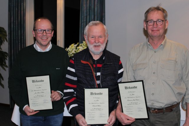 Jan-Bernd Klöker (links) und Hermann-Josef Siemer (rechts) erhielten vom 1. Vorsitzenden Stefan Meyer (Mitte) Urkunden als Dank und Anerkennung für 25jährige aktive Mitgliedschaft im Verein.